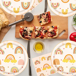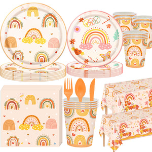 133PCS Bohemian Rainbow Party Supplies Bohemian Rainbow Baby Shower Tableware Set Including Paper Plate Napkins and Tablecloths Suitable for Bohemian Birthday Party Baby Shower Decoration Supplies