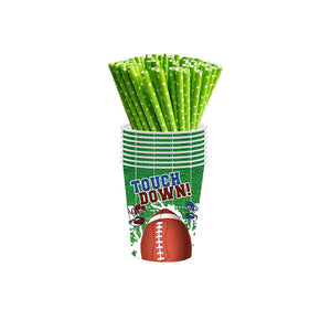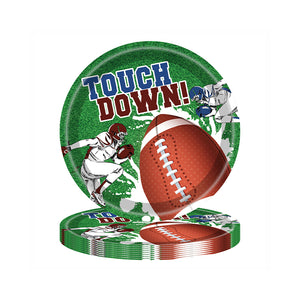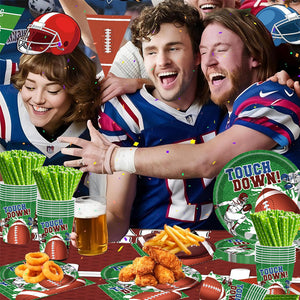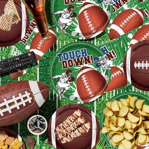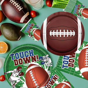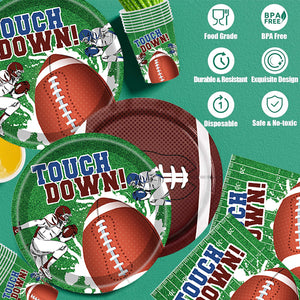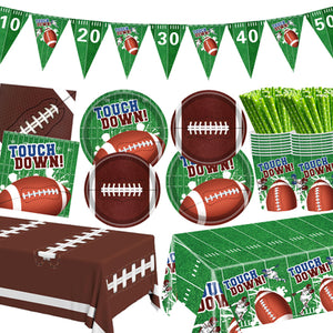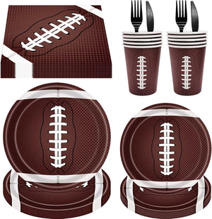 133PCS Disposable plates, cups, napkins, forks, spoons, and knives with a rugby theme are suitable for American football games, birthday parties, sports holidays, and gatherings
